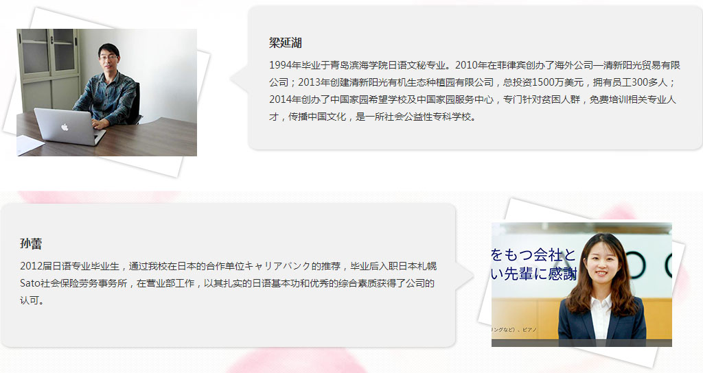 2.就業對口率高,職業發展前景好。畢業生在外資、外貿、外包、語言培養、旅行社等單位就職比例平均達86.4%,廣泛分布在青島及周邊地區多種行業并迅速成長為企業骨幹。
