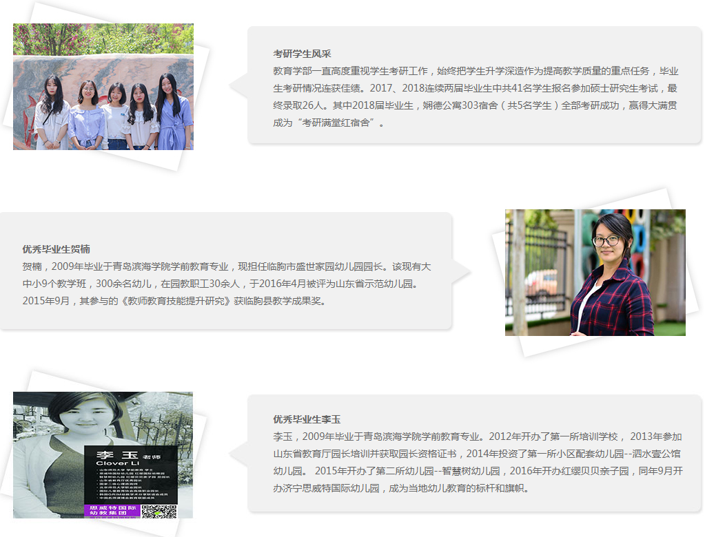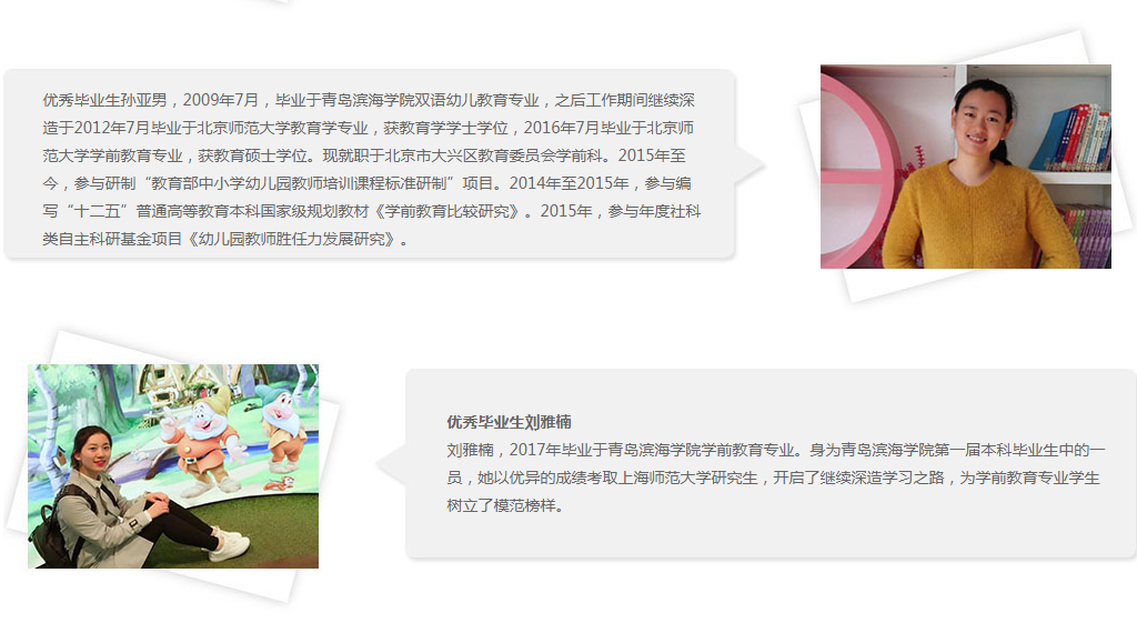 本專業為青島市市校共建重點專業,依托校内省級示範附屬幼兒園和兒童成長中心,校外專業聯盟幼兒園,實施“院園一體、學崗融合”的人才培養模式。教師團隊充滿活力,教學科研能力強,獲批多項省市級課題,獲多項省級教學大賽獎,指導學生獲獎多項。學生學前專業知識紮實,同時具備特殊教育專業技能,在省部級專業技能大賽中斬獲殊榮,獲批多項國家及省級大學生創新創業項目,專業彙報演出——兒童劇社會影響巨大,師範生實習支教反響熱烈。就業質量高,考取事業編制率高,考研錄取率高,赴外升學率高。